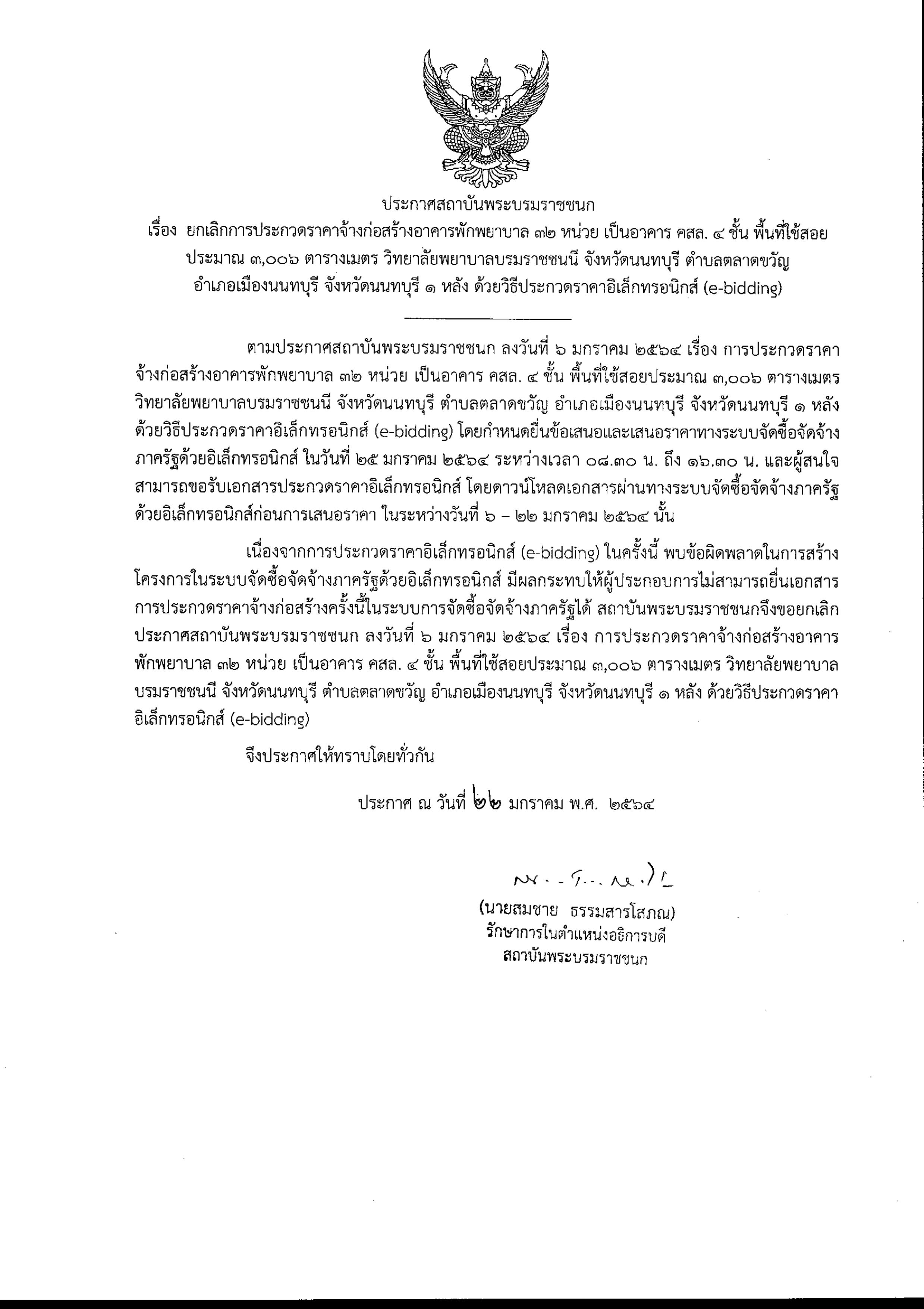 เรื่อง ยกเลิกการประกวดราคาจ้างก่อสร้างอาคารพักพยาบาล 32 หน่วย เป็นอาคาร คสล. 4 ชั้น พื้นที่ใช้สอยประมาณ 3,006 ตารางเมตร วิทยาลัยพยาบาลบรมราชชนนี จังหวัดนนทบุรี ตำบลตลาดขวัญ อำเภอเมืองนนทบุรี จังหวัดนนทบุรี 1 หลัง ด้วยวิธีประกวดราคาอิเล็กทรอนิกส์ (e-bidding)